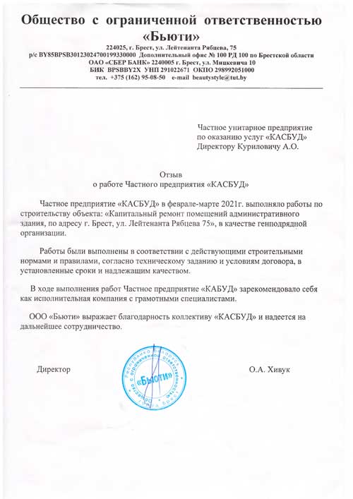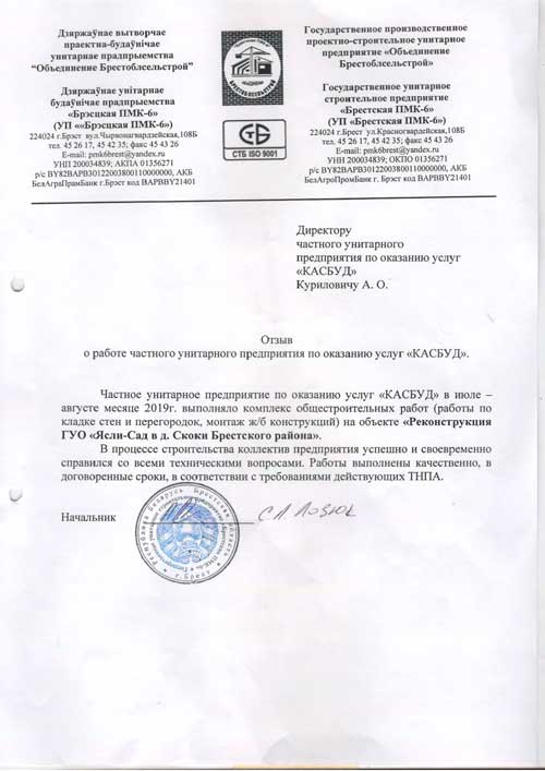Команда компании “КАСБУД” , много лет работая на рынке строительных услуг в Бресте и по Беларуси в целом, успело стать лидером рынка и  поучаствовать в самых разнообразных по видам и уровню сложности строительных проектах (от работ по реконструкции жилых домов до масштабного строительства многофункциональных объектов).