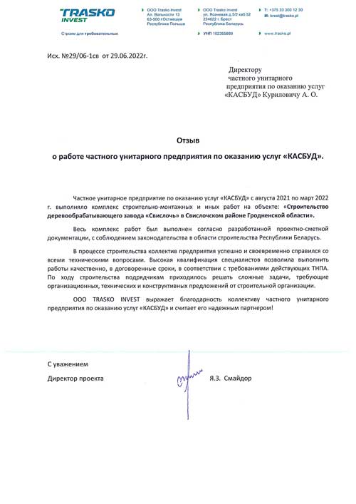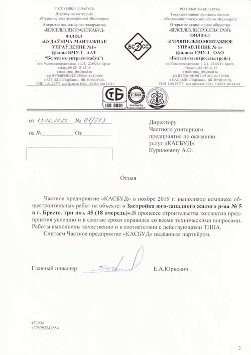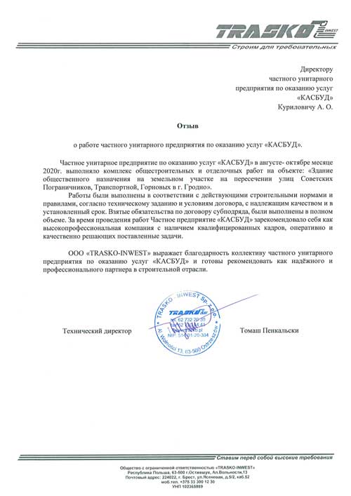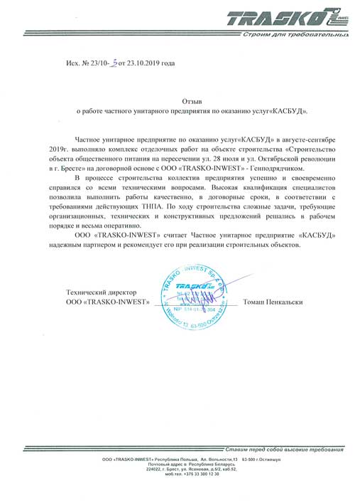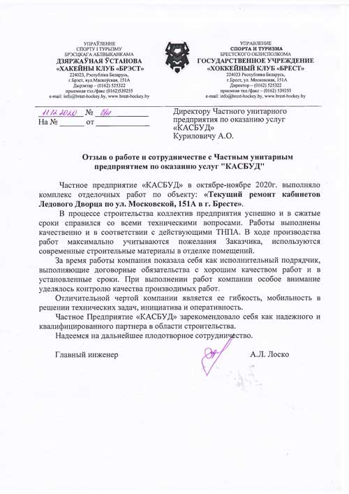 Команда компании “КАСБУД” , много лет работая на рынке строительных услуг в Бресте и по Беларуси в целом, успело стать лидером рынка и поучаствовать в самых разнообразных по видам и уровню сложности строительных проектах (от работ по реконструкции жилых домов до масштабного строительства многофункциональных объектов).